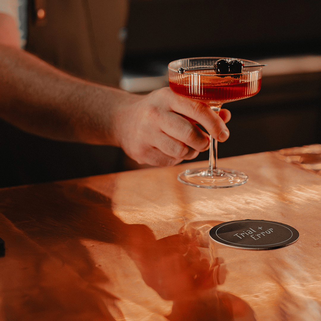 Trial+Error is a cocktail lounge and bourbon destination rooted in curiosity, craft, and community. Our back story – founded by two friends whose basement bourbon podcast turned into a full-blown spirits company. It all began with a mic, a couple of Glencairns, and an insatiable desire to learn more about whiskey. That spark became Pursuit Spirits, a bold, independent bourbon brand that celebrates transparency, exploration, and taste above hype.
